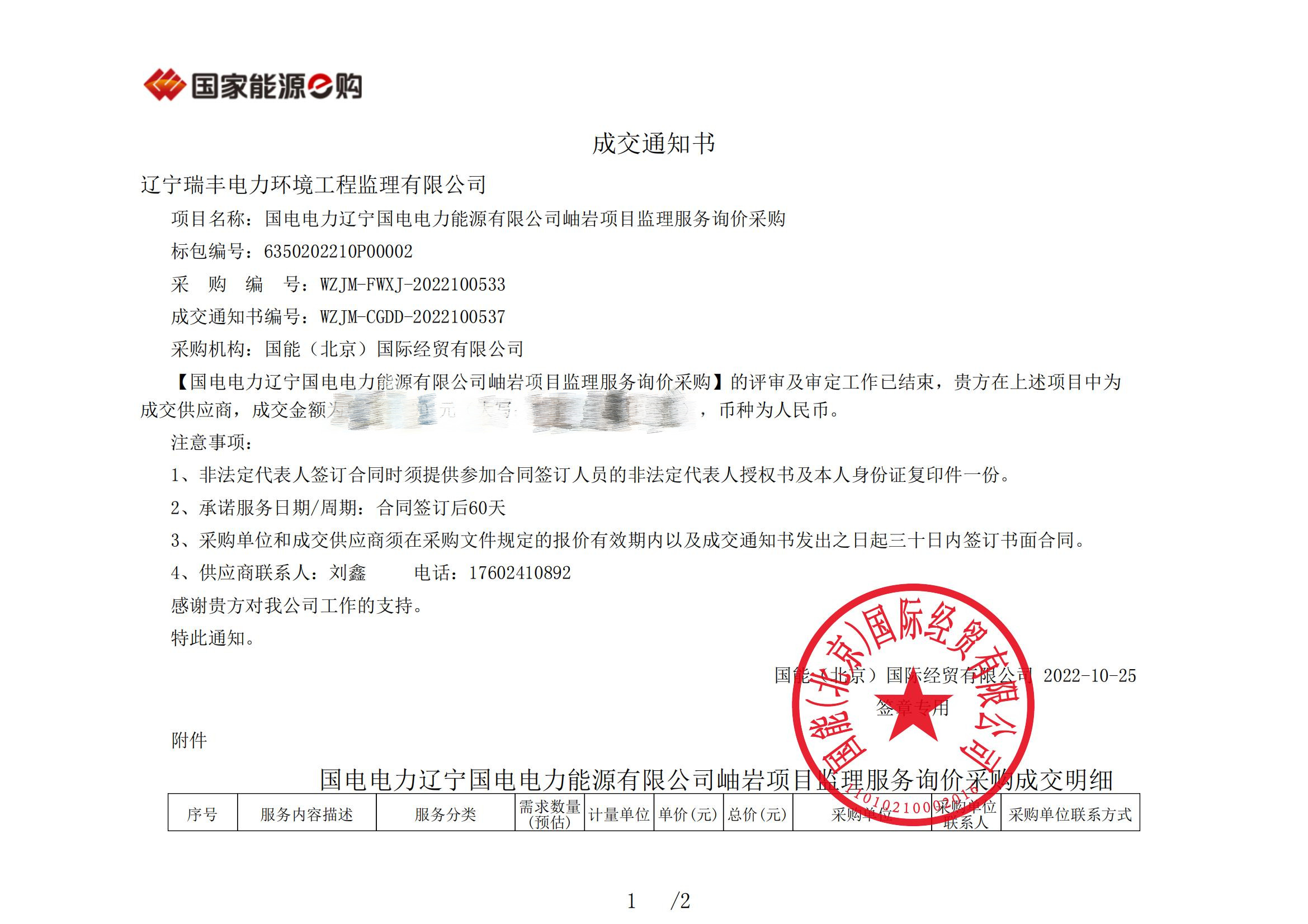 遼寧瑞豐電力環(huán)境工程監(jiān)理有限公司于2022年10月20日與鞍山國電電力新能源有限公司簽訂了《國電電力遼寧岫巖整縣光伏發(fā)電一期農(nóng)光、漁光互補(bǔ)項目》監(jiān)理合同。