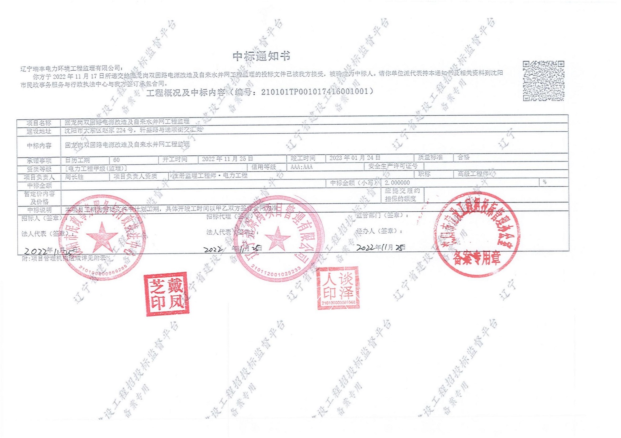 中標(biāo)喜訊-回龍崗雙回路電源改造及自來水并網(wǎng)工程監(jiān)理......